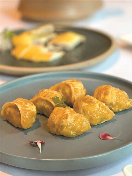 ▲甜龙笋与手剁黑毛猪肉做馅儿的煎饺。