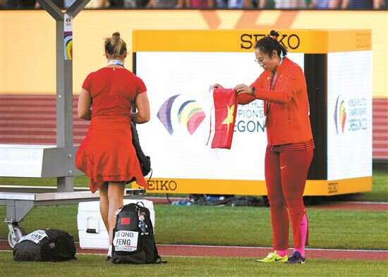 夺得俄勒冈田径世锦赛女子铁饼冠军后,冯彬回答记者的每一句话,都表现出一位山东姑娘的直率和爽朗。以下为记者与她的对话。