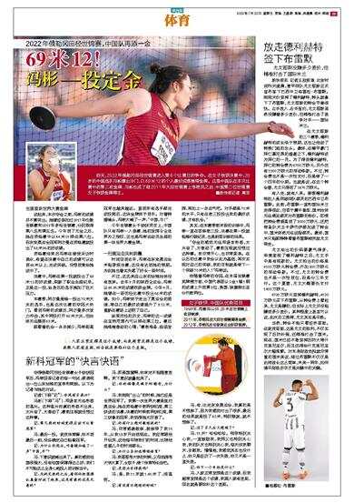 昨天,2022年俄勒冈田径世锦赛进入第6个比赛日的争夺。在女子铁饼决赛中,28岁的中国选手冯彬爆出冷门,以69米12的个人最好成绩摘得金牌。这是中国队在本次比赛中的第二枚金牌,冯彬也成了继2011年大邱世锦赛上李艳凤之后、中国第二位世锦赛女子铁饼金牌得主。