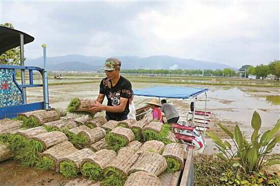 ■3月17日上午,在增城区朱村丝苗米基地,农民将培育好的秧苗装上插秧机。