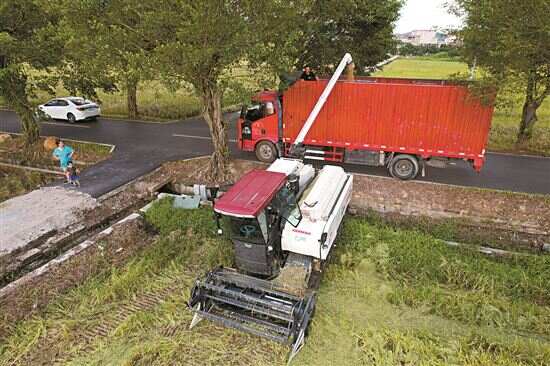 ■7月20日,在增城区丹邱村,完全机械化收割的水稻直接将收割机谷仓中的稻谷输入停在路边的卡车。
