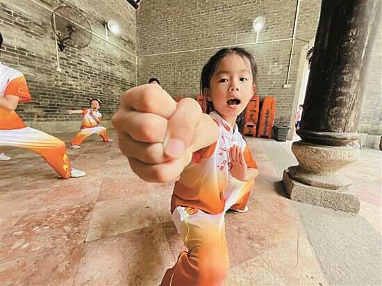盛夏时节,在番禺区南村镇的邬氏宗祠古建筑群里,不时传来孩子们一阵阵的呐喊声。近百名身穿武术服的孩子正顶着烈日习练,清脆的喊声和着出拳摆腿的风声,回荡在这座百年古祠间。