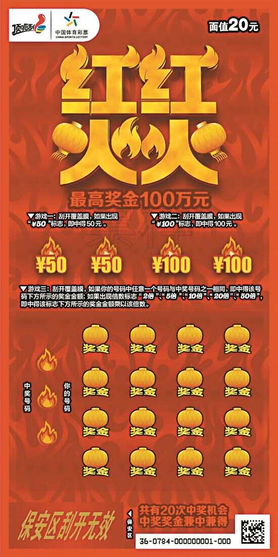 简单有趣的玩法带来多重惊喜与好运。“红红火火”即开票面值20元,共有20次中奖机会,最高奖金100万元。采用“找奖金符号+数字匹配”的游戏玩法,具体游戏规则为:游戏一:刮开覆盖膜,如果出现“¥50”标志或“¥100”标志,即中得50元或100元;游戏二:刮开覆盖膜,如果你的号码中任意一个号码与中奖号码之一相同,即中得该号码下方所示的奖金金额;如果出现倍数标志“2倍”“5倍”“10倍”“20倍”“50倍”,即中得该标志下方所示的奖金金额乘以该倍数。中奖奖金兼中兼得。