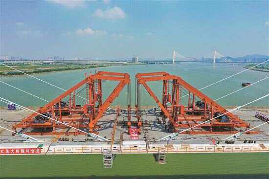 中铁建南沙投资发展有限公司相关负责人介绍道,红莲大桥位于南沙区万顷沙,采用双塔双索面混合梁斜拉桥型,主桥全长912米,飞跨珠江水系龙穴南水道的主桥跨度长达580米,主塔高度180米,建成后将成为国内最大跨度的多功能市政斜拉桥。
