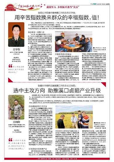 从脱贫攻坚到乡村振兴,王守信三次主动请缨奔赴乡村一线。“我们每个人必须拥有家国情怀。”正如他在信中所说,身为一名共产党员和帮扶老兵,舍小家顾大家,“用自己的辛苦指数换来群众的幸福指数,我觉得很值!”