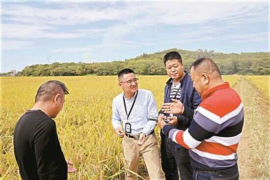 ■驻磷溪镇工作队队长王向阳(左二)在仙田一村百亩稻田走访调研。 新快报记者 孙毅/摄