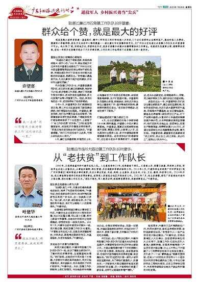 笔直宽敞大道两旁新建一盏盏路灯,镇中心即将完工的灯饰迎接八方来宾,5个过亿投资的企业顺利落户,整洁村落人头攒动,援建的小学教学楼、居民文化活动中心顺利奠基……湛江廉江市石角镇的新变化,与广州白云区驻湛江石角镇工作队队长许望喜密不可分。他从军27载,回到地方后,积极响应号召,投身石角镇乡村振兴驻镇帮镇扶村工作事业。他推动队伍建章立制、理顺帮扶思路,进驻一年便为石角镇百姓办了不少好事实事,工作队的工作也得到了石角镇人民的一致好评。