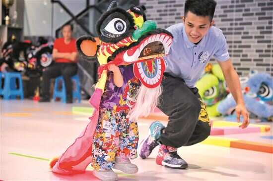 ■一个小孩举着狮头,在教练的指引下踏步前进。这个暑假,广州一些孩子选择醒狮作为兴趣班,既锻炼身体,又可以感受传统文化的魅力。新快报记者 李小萌/摄