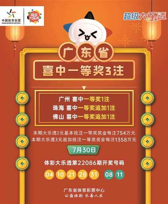 新快报讯 记者陆妍思报道 7月30日,体彩超级大乐透第22086期开奖,广东当期中出3注头奖,其中2注1358万余元追加投注一等奖,分落佛山、珠海,1注754万余元基本投注一等奖落户广州。