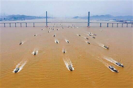 8月1日,出海的渔船从浙江台州湾大桥驶入东海。当日中午12时,浙江沿海地区的部分渔船结束伏季休渔,驶出渔港,奔赴渔场。