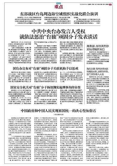 在涉及主权领土完整的大是大非问题上,任何一个国家都没有妥协退让余地。一个中国原则是中国同任何国家发展关系的前提和基础,我们绝不允许“越线”行为。台湾问题事关中国国家主权和领土完整,涉及中国核心利益,是中美关系中最重要、最敏感的核心问题。美方变本加厉搞“以台制华”,将台海局势推向进一步紧张,必将付出沉重代价。中国政府和中国人民在台湾问题上的立场是一以贯之的,坚决维护国家主权和领土完整是14亿多中国人民的坚定意志。中方早已严正申明,如果美方一意孤行,必将采取强有力措施挫败任何外部势力干涉和“台独”分裂的图谋。中国人民说到做到。任何人都不要错估中国人民捍卫国家主权和领土完整的坚强决心、坚定意志、强大能力。