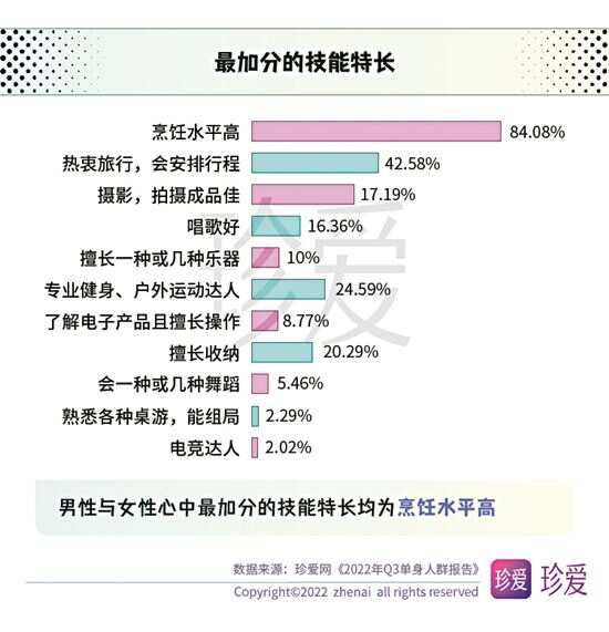 调研显示,超六成人要求另一半有房或有购买能力,约五成人要求另一半学历专科及以上;超半数人较为在意另一半的外貌,最受欢迎的男性身高为170-175cm,最受欢迎的女性身高为160-165cm;擅长做饭、制定旅行行程和健身是恋爱对象的最大加分项,而约会时炫耀吹牛、性别歧视、毛手毛脚行为最让好感度直线下降;近半数人最理想的结婚年龄为26-30岁,超五成人认为恋爱花销分配方式无所谓,顺其自然。