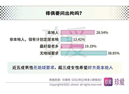 在地域偏好上,有38.85%的人对地域无要求,28.54%的人希望对方可以是本地人,19.19%的人希望对方最好是老乡,13.42%的人希望对方非本地人,但计划定居本地。