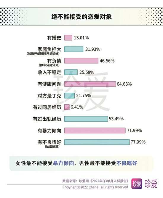 单身人群在择偶过程中也存在一些底线和禁忌。调查发现:有不良嗜好、暴力倾向、健康问题、出轨经历、有负债(车贷房贷除外)都是大部分单身人群不能接受的问题,其次家庭负担大、对方收入不稳定、对方是丁克、有婚史和同居经历也是部分人顾虑的问题。