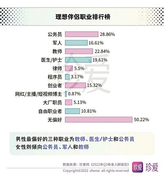 部分职业也受到了单身人群的特别青睐。择偶过程中,近半数人(49.78%)对另一半的职业有一定偏好。排名前五位的理想伴侣职业分别为公务员、教师、医生/护士、军人、创业者。其中,女性最偏好伴侣的三种职业为公务员、军人和教师;而男性则倾向于教师、医生/护士和公务员。