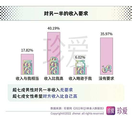 关于另一半的收入,仅35.97%的人表示没有要求,40.19%的人希望对方收入高于自己,17.82%的人要求双方收入相当,另有6.02%的人希望对方收入略逊于自己。