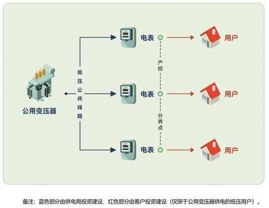 答:按照国家有关规定,产权分界点是供用电双方运行维护管理以及安全责任范围的分界点,计量装置(表计)安装在产权分界点。低压充电设施接入电网的外线工程(含表箱、表计)不收费(如图所示)。