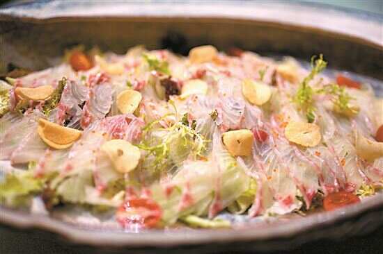 以金鲷沙律鱼生这道菜为例,它实际上是一道典型的中西融合菜品,师傅选用了鱼肉口感最佳的2斤8两到3斤左右重量的金鲷,用日式生鱼片的刀法片出鱼片,再用顺德捞起鱼生的方式佐以黑松露加玫瑰盐加独头蒜熬制成的蒜香油,配上西式杂菜一同捞匀了吃,独特!新颖!连容器都带着浓郁的“佛山味道”标签,一枚鲍鱼壳形状的佛山陶瓷,美食配美器,相得益彰得很。
