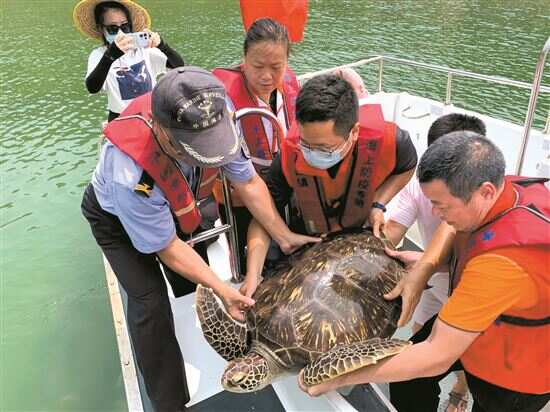 7月29日上午,万山大队联合万山镇政府、东澳派出所、万山村委、东澳岛海洋馆及渔民代表,将海龟送至白沥岛附近海域放生回大海。
