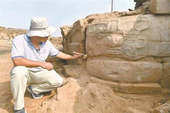 据陕西省考古研究院研究馆员、石峁遗址考古队副队长邵晶介绍,目前这件石雕的发掘还在进行中,根据以往发掘资料,这类大型石雕上一般会有一组三个人面,石雕整体长度应超过2米,而目前已出土的东侧人面应在整组图像中处于居中位置,可能就是石峁先民的“王”的形象。