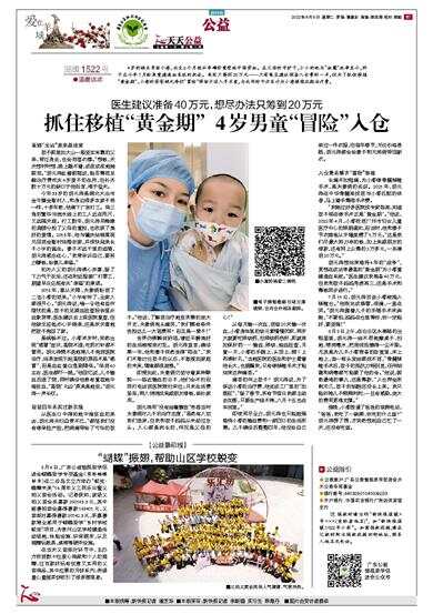 4岁的湖北男孩小澎,出生6个月就不幸确诊重型地中海贫血。在父母的守护下,小小的他与“血魔”抗争至今,终于在今年7月盼来重建造血系统的机会。虽然只筹到20万元——只有医生建议预备入仓费的一半,但为了抓住移植“黄金期”,小澎的爸爸胡元涛仍“冒险”将孩子送入手术室,与此同时千方百计为小澎接续后期治疗费。