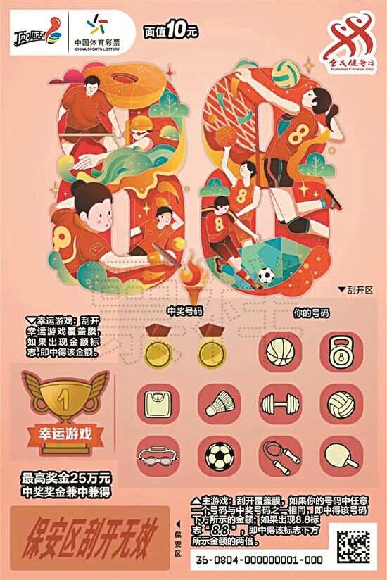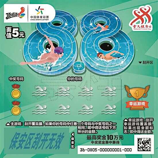 据了解,“全民健身 我来啦”系列即开票以全民健身作为主题游戏,票面设计将运动形象和8月8日全民健身日相结合,展示了体育运动的丰富多彩和体彩的体育特色。该票种共有5元和10元两种面值,5元票面有三种场景,三种不同颜色票面上的“88”数字,搭配游泳、滑雪、跑步等运动,数字“88”化身泳池、冰雪、跑道等不同形象,让运动的感觉扑面而来;10元票面也有三种场景,分别展现了排球、羽毛球、短道速滑等,形象地展示了体育运动的丰富多彩。