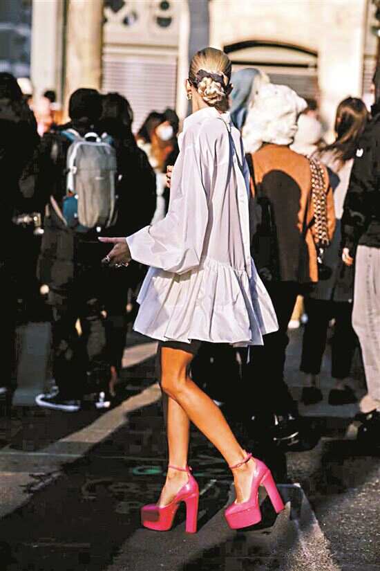 从秀场趋势可知,即使到2022年秋冬甚至2023年春夏,这波潮流仍然依旧;Marc Jacobs用厚底排扣纯色防水台高跟鞋营造高调复古感;Nina Ricci用反光防水台衬托“现代极简主义嬉皮士”范儿——即便如此,防水台高跟鞋的厚重感依然是被诟病的“时尚槽点”,想赶这趟时髦的潮流人士,选款和搭配技巧都值得考究。