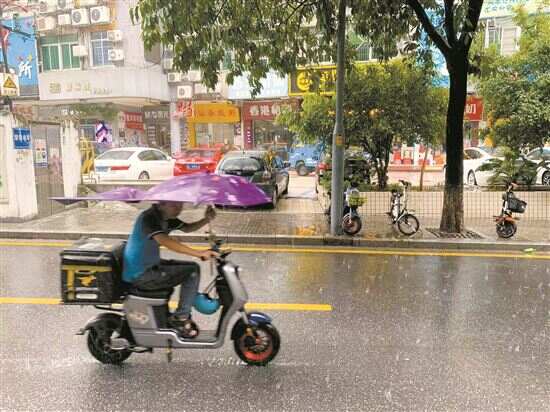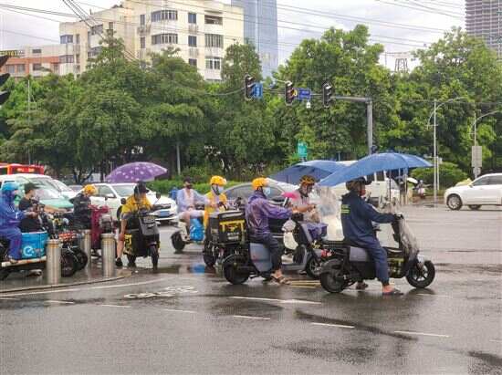 ■10日中午暴雨,员村附近一些外卖员的电动车上装了遮雨篷。
