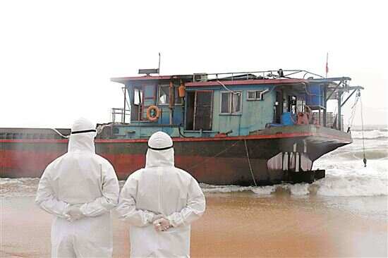 执法艇到达指定海域后进行搜查,发现一艘无船名船号的可疑铁质散货船搁浅在近海沙滩处(见下图),执法员不顾风大雨急立即登船进行检查,发现该船舱内有大量白色及黑色太空袋,带内纸箱表面有明显的外文标识,装有疑似来自境外的牛肚、猪肚、羊肚等冻品约110吨,船上未发现任何有关该批冻品的相关合法来源手续及相关检验检疫证明,海警执法员与赶到现场的民警立即对该船舶与船上货物进行查扣。