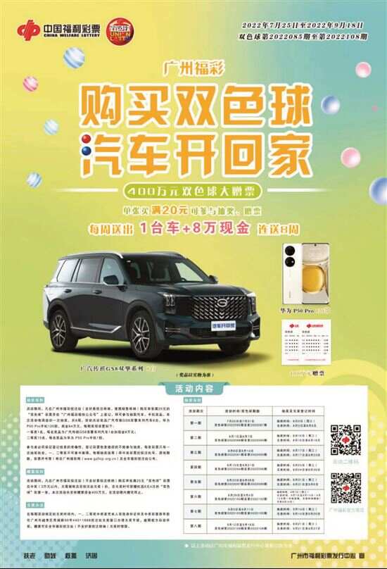 活动参与方式非常简单,在广州市福利彩票投注站(含便携销售终端)购买单张满20元的双色球彩票,在“广州福彩”微信公众号登记符合条件的彩票信息后,即可参与抽奖。本次活动共8期,每周一至周日为1个周期,次周的周三组织1期抽奖。活动每期设一等奖1名,奖品为广汽传祺GS8汽车1辆和8万元现金;设二等奖15名,奖品为华为P50 Pro手机1部。