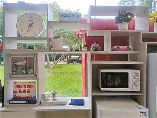▲二沙岛党群服务驿站中有药箱、微波炉、冰箱供市民游客使用。