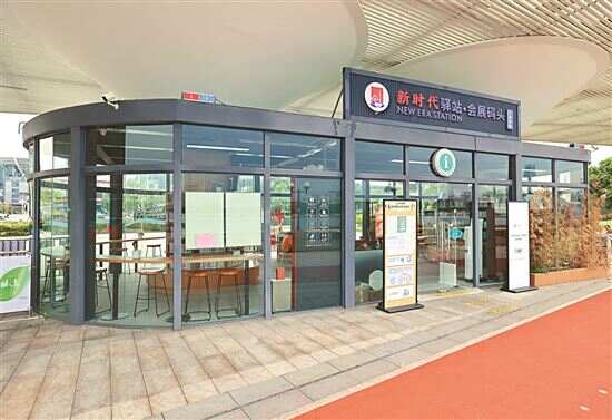会展东新时代驿站占地面积约500平方米,建筑面积205平方米,层高6米,分为驿站门前广场、展示区、智能阅读区、互动区和服务区5个区域。展示区以照片展示海珠历史和时代的发展变迁;智能阅读区提供党史学习教育相关的实体书籍、电子读物;互动区设置多功能智慧大屏幕供市民现场合影并打印;服务区则设有咖啡店、直饮水、充电宝、应急救助、便民伞、洗手间等便民设施和服务项目。驿站还定期组织开展“学习强国”一站到底知识擂台赛、“我在海珠玩非遗”“艺术名家进驿站”等文明实践系列品牌活动,并为邻近的企业提供活动场地。