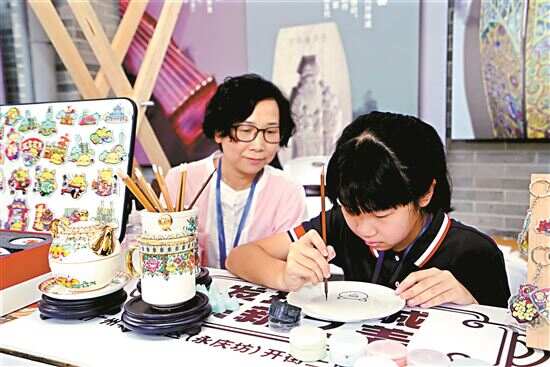 ■小朋友在广彩摊位体验广彩绘制。