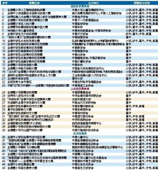 根据《教育部办公厅等四部门关于印发〈面向中小学生的全国性竞赛活动管理办法〉的通知》精神,由主办单位自主申报,经组织专家进行严格评审把关,拟确定全国青少年人工智能创新挑战赛等45项竞赛为2022—2025学年面向中小学生开展的全国性竞赛活动,举办时间原则上为2022年9月至2025年8月,在此期间每学年举办不得超过1次,累计不超过3次。公示期为8月23日至29日。(央视)