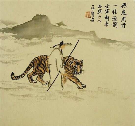 区广安笔下的每一幅“虎年话虎”减笔画,都以“大道至简,简而不凡”的理念而创作。他用简练的水墨线条刻画虎,画面栩栩如生,画作中的人物,均被作者进行减笔的处理,让人浮想联翩,达到笔到意达的效果。