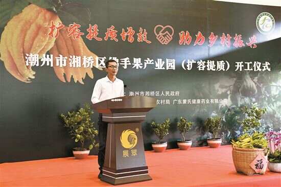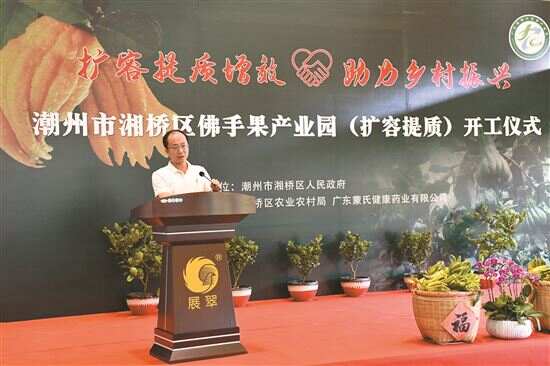 佛手果老香黄是“潮州三宝”之首,远近闻名。作为制作老香黄的主要原料,市场对佛手果的需求一直很旺盛。日前,佛手果产业迎来了发展大机遇—— 8月26日,潮州市湘桥区在广东省佛手果文旅生态园举办佛手果产业园(扩容提质)开工仪式,旨在将佛手果产业园打造成主导产业特色鲜明、要素高度聚集、设施装备先进、生产方式绿色、经济效益显著、辐射带动有力的现代化农业产业园区。湘桥区副区长李伟雄、潮州市农业农村局四级调研员陈润楷、湘桥区农业农村局局长张映浩等出席了仪式。