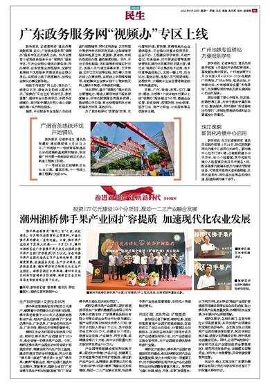 湘桥区农业农村局局长张映浩介绍说,湘桥区佛手果产业园建设于2019年,是全省唯一的佛手果产业园。今年,湘桥区佛手果产业园成功申报省级扩容提质项目,将建设现代化生产加工基地,建设非遗技艺研学科普基地,努力打造“佛手果+旅游”“佛手果+文创”“佛手果+康养”等新业态,将产业园打造成为立足潮州,享誉粤东,辐射全省的“广东省佛手果生产科研创新高地”和“广东省佛手果文旅生态休闲示范区”。