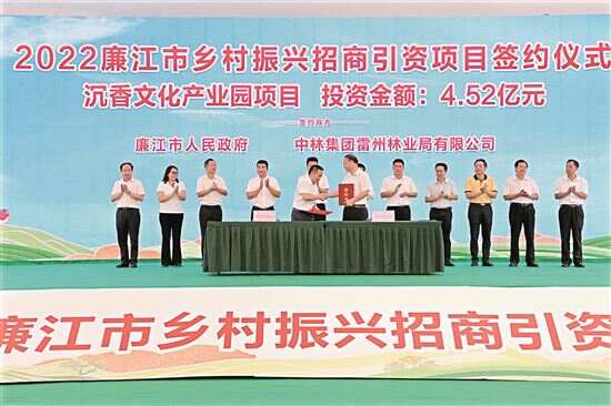 ■廉江市乡村振兴招商引资推介会上, 廉江市政府与中林集团雷州林业局有限公司签下沉香文化产业园项目,投资4.52亿元。