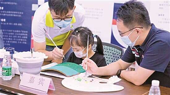 ■小朋友在志愿者指导下制作瓦片画。