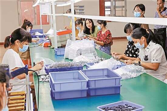 去年11月份开业的云浮市万信电子科技有限公司连滩厂区内,妇女们正在生产线上聚精会神地忙碌,机器作业声在宽敞整洁的生产车间里回荡。覃金华称,该通信线材加工企业在周边城市先后开办了5个加工厂,去年工作队了解到其有意回到郁南设厂后便积极联系对接,并通过金融顾问助力该企业申请400万元的信贷支持,最终让其落户连滩。