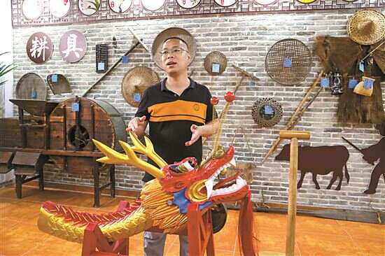 ■英南村党总支书记、村委会主任胡日强在乡贤展览馆内讲述英南村的龙舟文化。