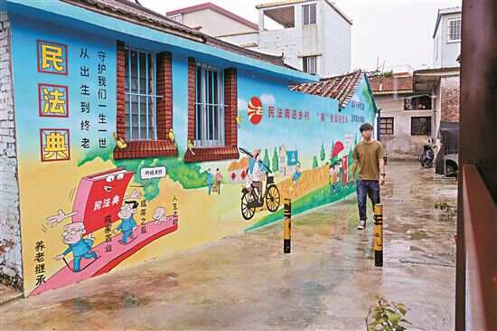 同样位于礼乐街道的威东村也有五彩墙绘,除了宣传乡风文明,还有一处专门宣传《民法典》。“我们提炼了法条中的重要元素专门设计普法墙,用重复视觉效果强化村民对法律的认知。”骆菁菁是江海区审计局派驻威东村的第一书记,经过一年多潜心工作,她已对威东村各项情况了然于胸。