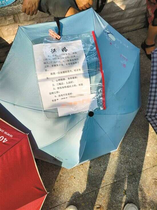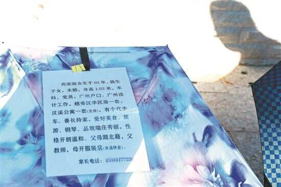 ■为助攻子女尽早觅到姻缘, 父母在伞上贴上了子女的简历。