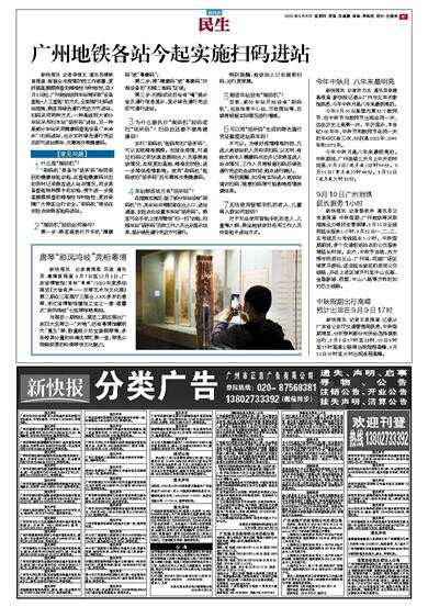 新快报讯 记者李佳文 通讯员穗铁宣报道 根据全市疫情防控工作部署,更好提高溯源排查的精准性与时效性,自9月8日起,广州地铁线网车站将采取“设备查验+人工查验”的方式,全面推行扫码进站措施,乘客持绿色通行凭证方可进站。扫码采用两种方式,一种是线网大部分车站采用扫本站“场所码”进站,另一种是部分车站采用健康码查验设备(“刷码机”)扫码进站,出示实时绿色通行凭证后即可进站乘车,无需再次亮健康码。