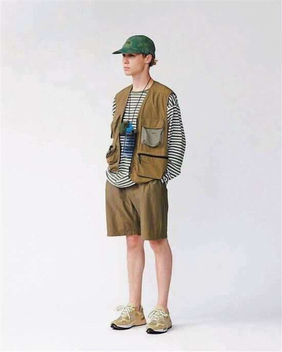 ▶T恤叠穿功能性马甲或机能风衬衫,适当搭配墨镜、手链、手表等配饰,“山系感”造型穿搭立现。