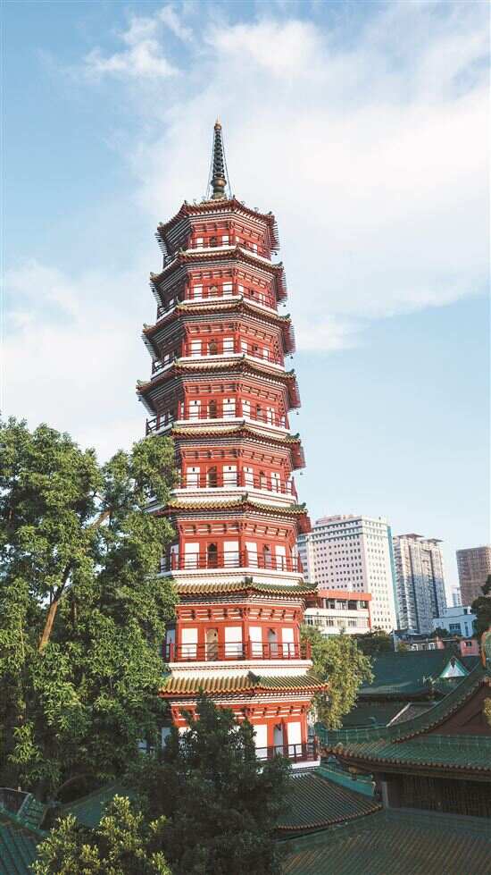六榕塔 始建于南朝刘宋年间(420年-479年),坐落于六榕寺中央。外观9级,内连暗层共17层,高57.6米。