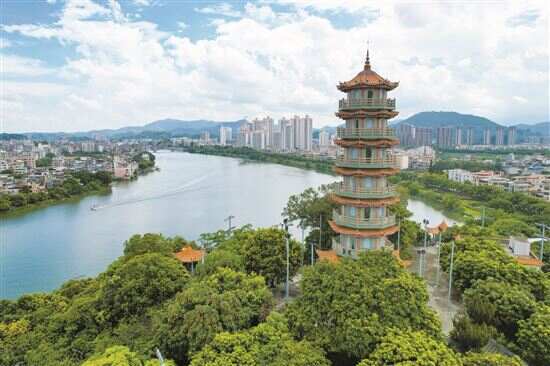雁塔 是增城区现存的唯一古塔,建于明代万历二年(1574年),位于荔城豸山上,紧靠碧波荡漾的增江。雁塔外观七层,内分十三层,高达32米。