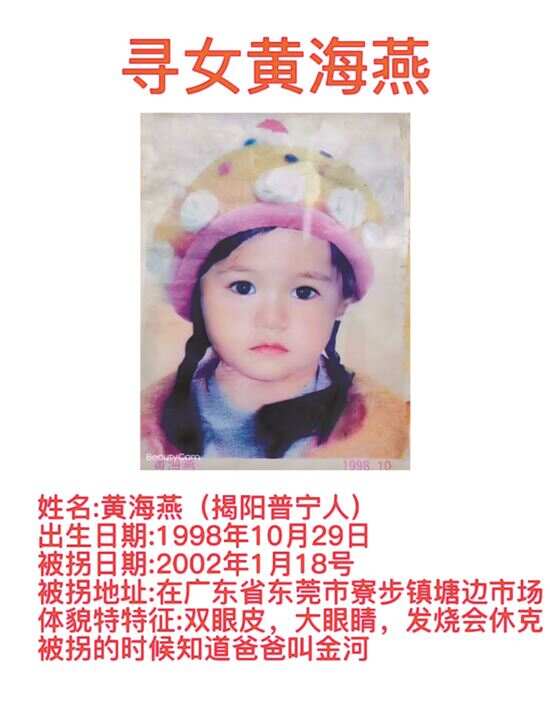 直到2005年,终于有好消息传来。警察通知他们,拐走海燕的人贩子被抓住了。“通过审理得知,人贩子把海燕送去给了汕头潮阳区的一个农村孤寡老人,原来这么些年,海燕就在离我们老家一个多小时车程的地方!”黄锦虾说,但可惜的是,根据人贩子提供的线索,警察赶去了潮阳区,却得知这位孤寡老人早已去世,而海燕却不知所踪。
