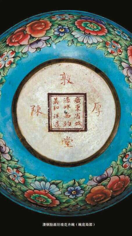 ■清铜胎画珐琅花卉碗,足底以红釉书“广东省城濠畔西约义和祥造”双方框款。广东省博物馆藏。