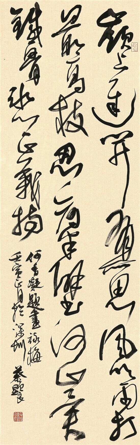 ■蔡显良,行草诗轴《何香凝·题画咏梅》释文:“岭上迟开有所思,风吹雨打最高枝。忍看半壁河山异,铁骨冰心正义持。”